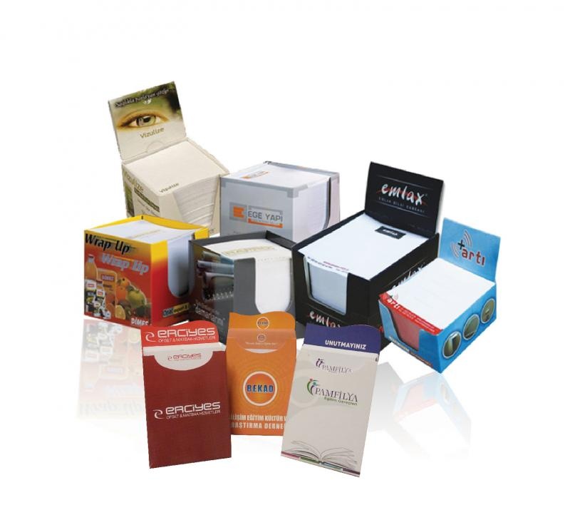 kağıtlarında firma amblemi basılabilmektedir. Bloknot Çeşitleri; Spiralli bloknotlar, Tutkallı bloknotlar, Sırttan dikişli koparmalı bloknot, Sert Kapaklı Spiralli Bloknotlar, Perforajlı Bloknot, Termo Deri Defter vb.